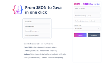 JSON to POJO, geliştiricilerin JSON verilerini hızlı bir şekilde Java'daki Plain Old Java Objects (POJO) formatına dönüştürmesine olanak tanıyan bir Chrome uzantısıdır. Bu araç, Spring Boot, Android ve diğer Java projeleri için idealdir. Kullanıcı dostu arayüzü sayesinde herhangi bir JSON verisini tek tıklama ile Java sınıflarına dönüştürmek mümkündür. Ayrıca, karmaşık JSON yapıları için otomatik olarak iç içe POJO'lar oluşturma özelliği sunmaktadır.